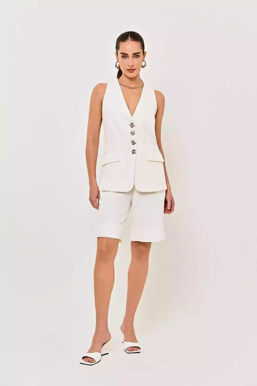 A bermuda Mariela é feita em alfaiataria, disponível na cor off white. Possui modelagem reta, cós aplicado em cintura média, bolsos laterais e posteriores. Bermuda elegante com modelagem estratégica que permite um look para trabalho ou passeio diurno.