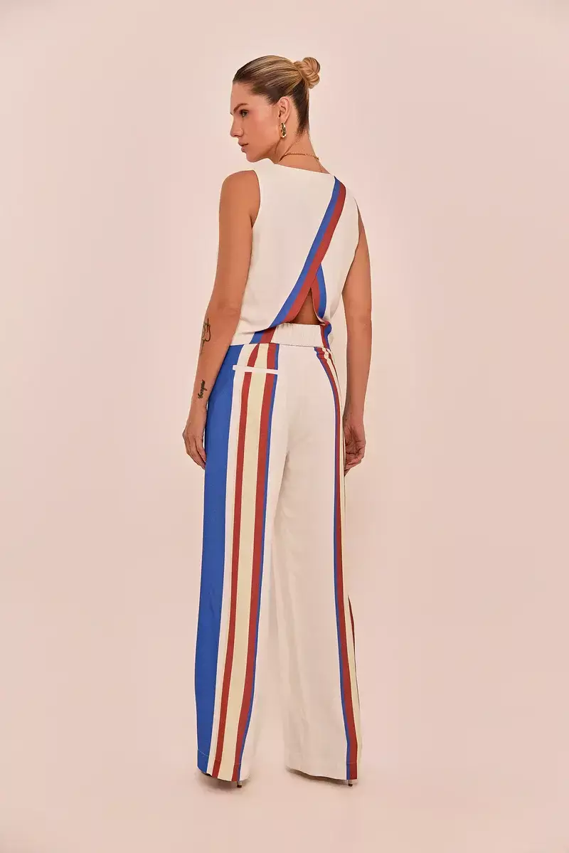 A blusa Samantha é feita em viscose, disponível na cor off white. Possui modelagem slim, regata com gola redonda e acabamento simples. Detalhe de recorte nas costas com aplicação de estampa listrada localizada.