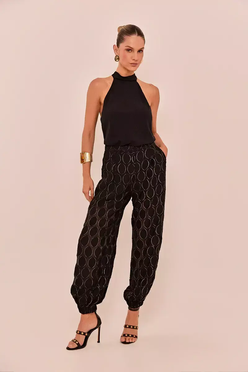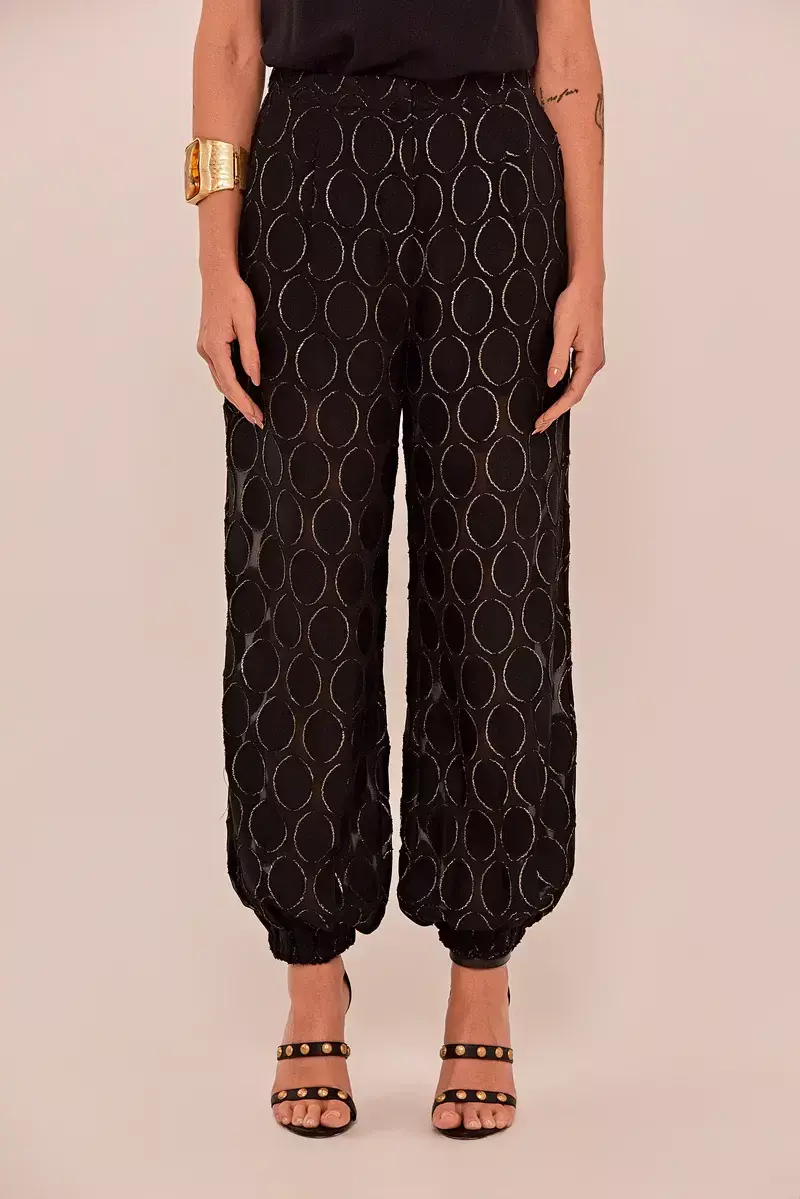A calça Paula é feita em voil e lurex, disponível na cor preto com detalhes dourados. Modelo harem pants, modelagem ampla, cós aplicado. Possui leve transparência e acompanha shorts de forro em mesma cor para maior conforto.