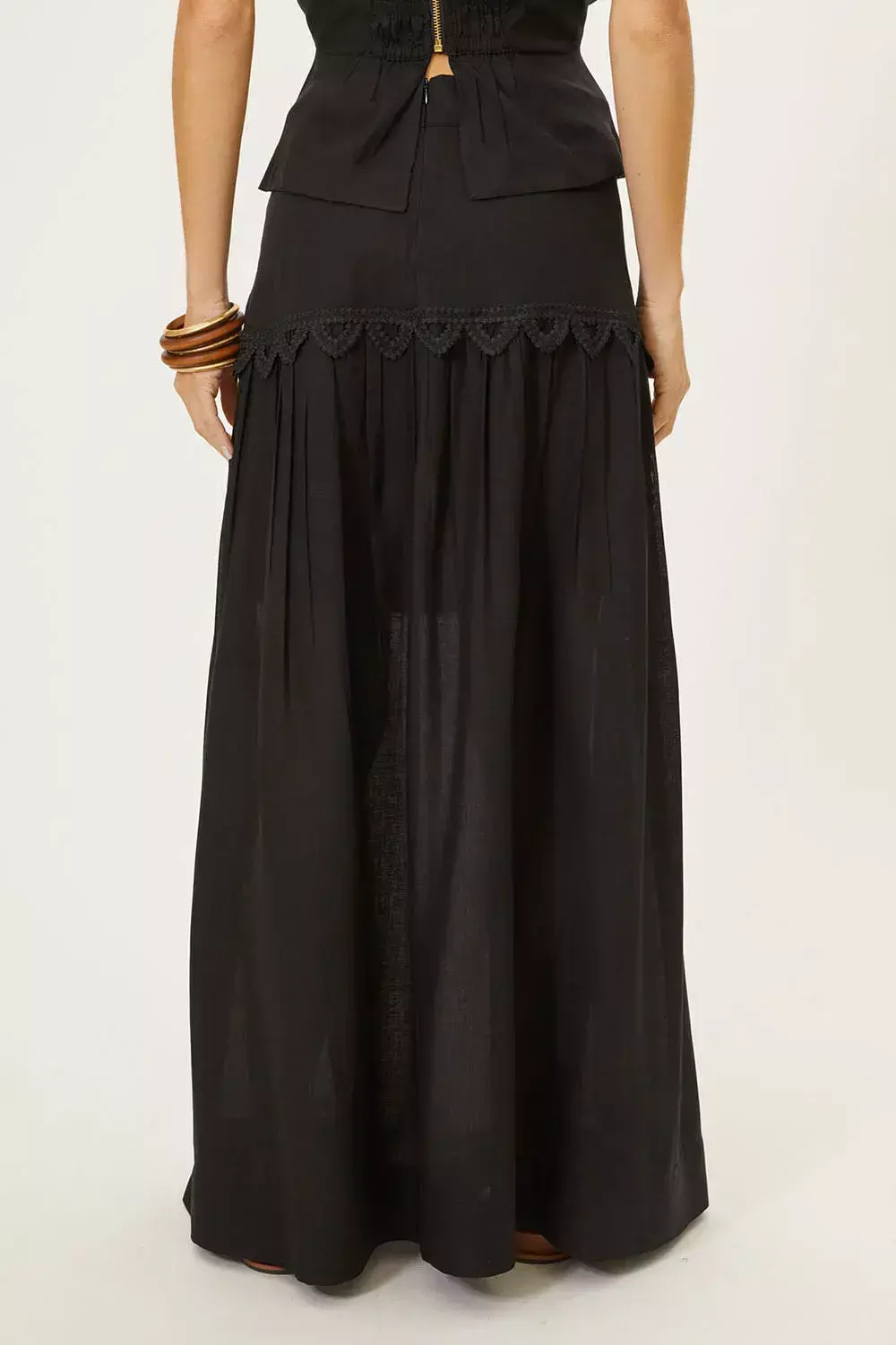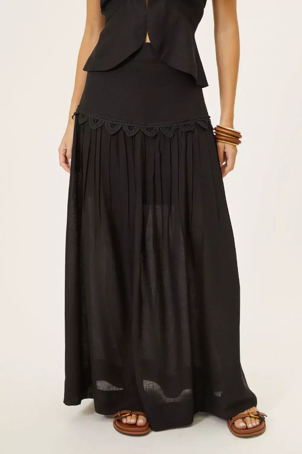 Saia Longuete Com Detalhe De Renda Na Pala. Possui Zíper Invisível Traseiro E Forro Curto.