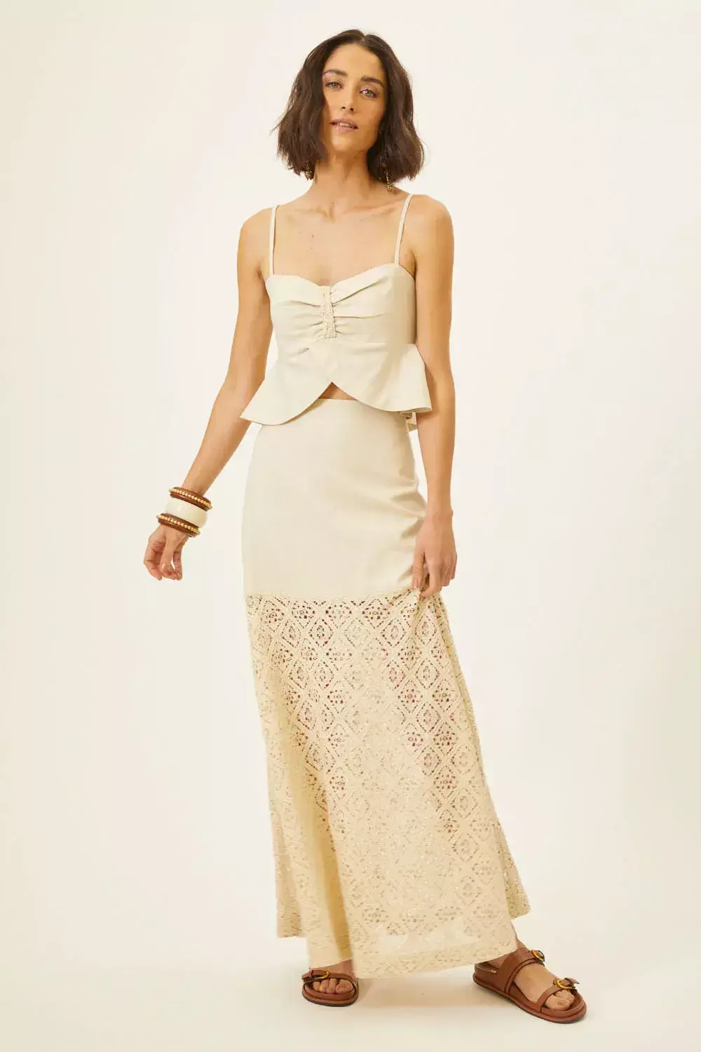 Saia Longuete Com Recorte E Saia Em Tela Rendada. Zíper Invisível No Traseiro, Barra Larga Com Revel.