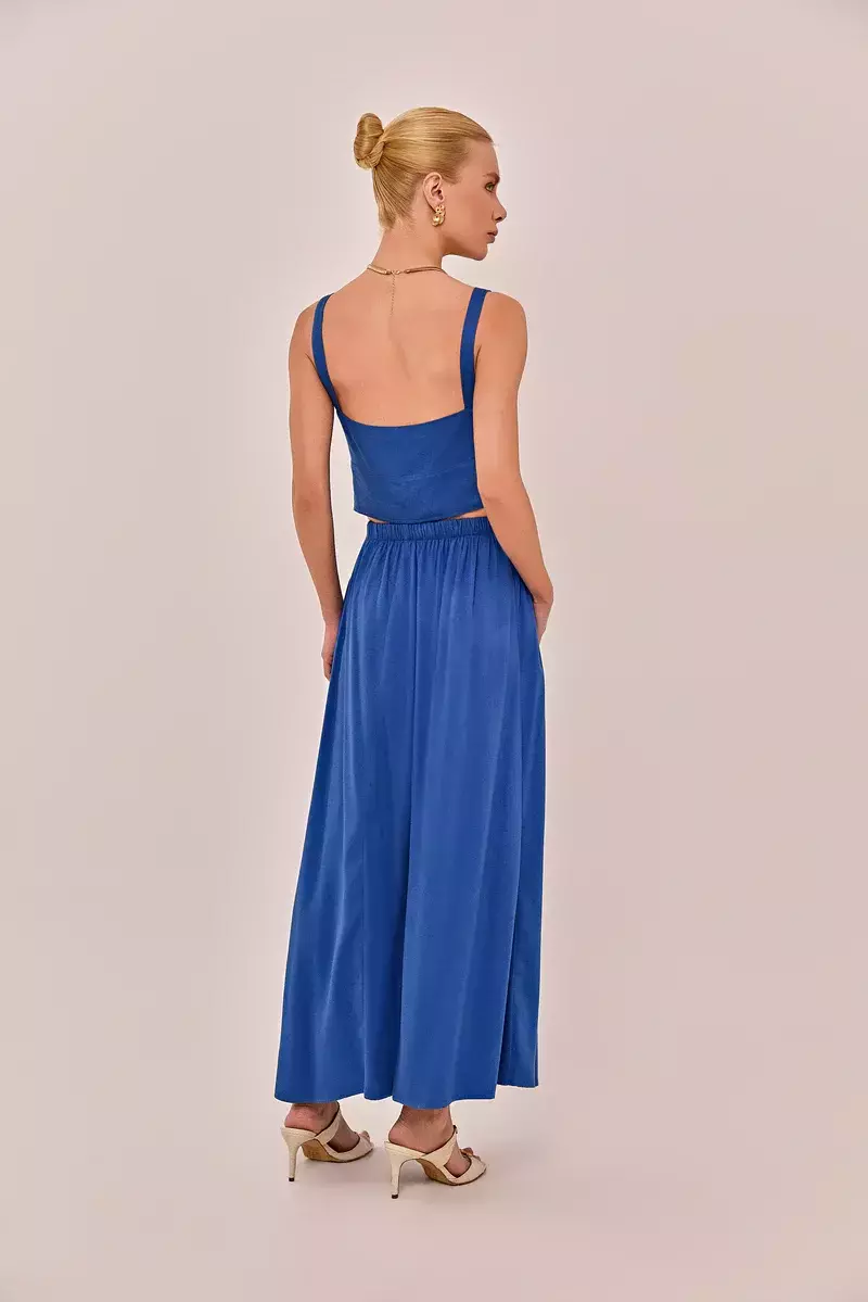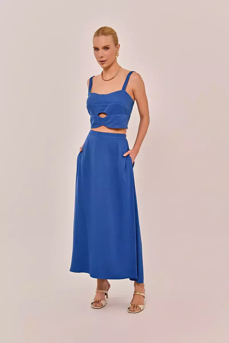 A saia Ana Laura é feita em viscose, disponível na cor azul. Possui modelagem evasê, cós aplicado, comprimento longo, bolsos laterais e barra simples. Saia elegante em tom clássico, ideal para compor looks descomplicados.