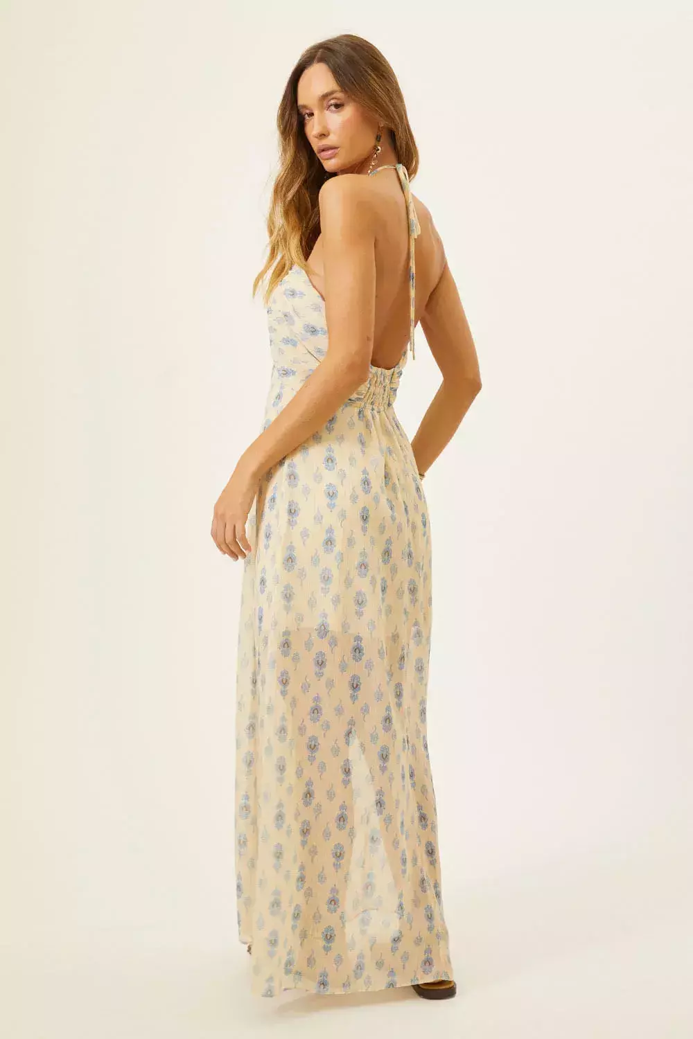 Vestido Longuete Estampado Com Forro Curto E Com Amarração No Pescoço. Possui Detalhe De Franzido No Busto E Elástico Com Zíper Invisível Nas Costas.