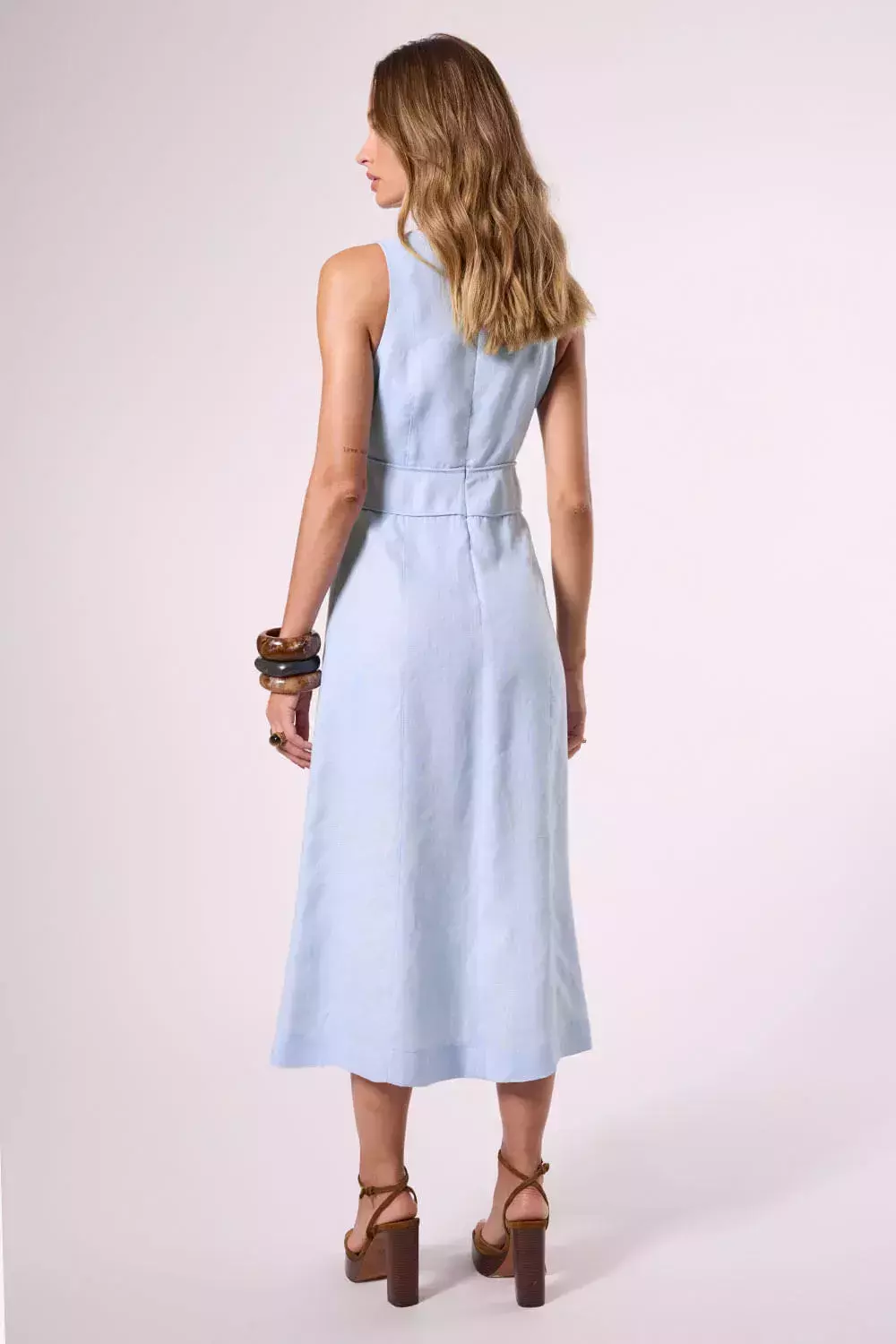Vestido Midi Com Decote Em V, Cordões Para Amarrar E Deblu Por Toda A Parte De Cima. Possui Forro Curto E Zíper Nas Costas.