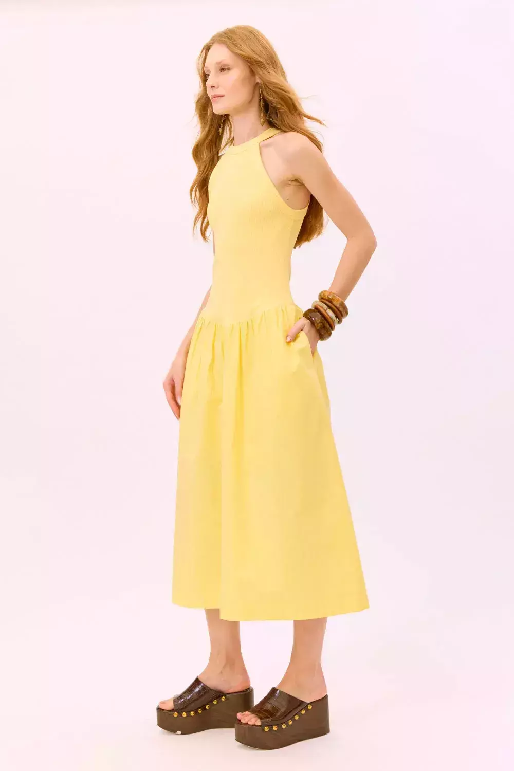 Vestido Longuete Com A Parte De Cima Feita Em Malha Canelada E Parte Da Saia Feita Em Algodão. Possui Forro Curto E Bolso Embutido Nas Laterais.