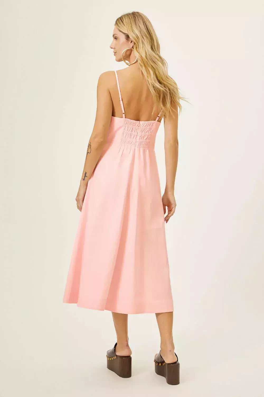 Vestido Midi Com Forro, Alças Finas Com Regulador, Amarração E Vazado No Busto. Possui Elástico E Zíper Invísivel Nas Costas.