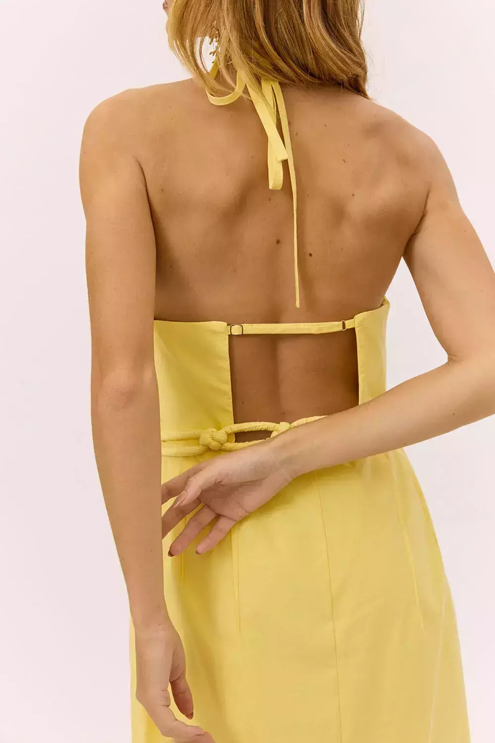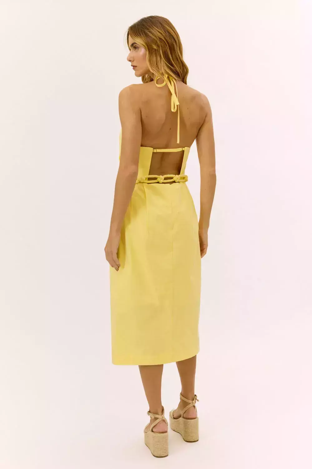 Vestido Midi Feito Em Algodão Com Forro Curto. Possui Vista Na Frente, Bolsos Embutidos Laterais, Amarração Frente Única No Pescoço E Vazado Com Regulador Nas Costas. Tem O Detalhe De Pences Na Frente No Traseiro E Cinto Avulso.