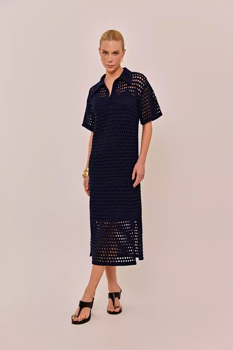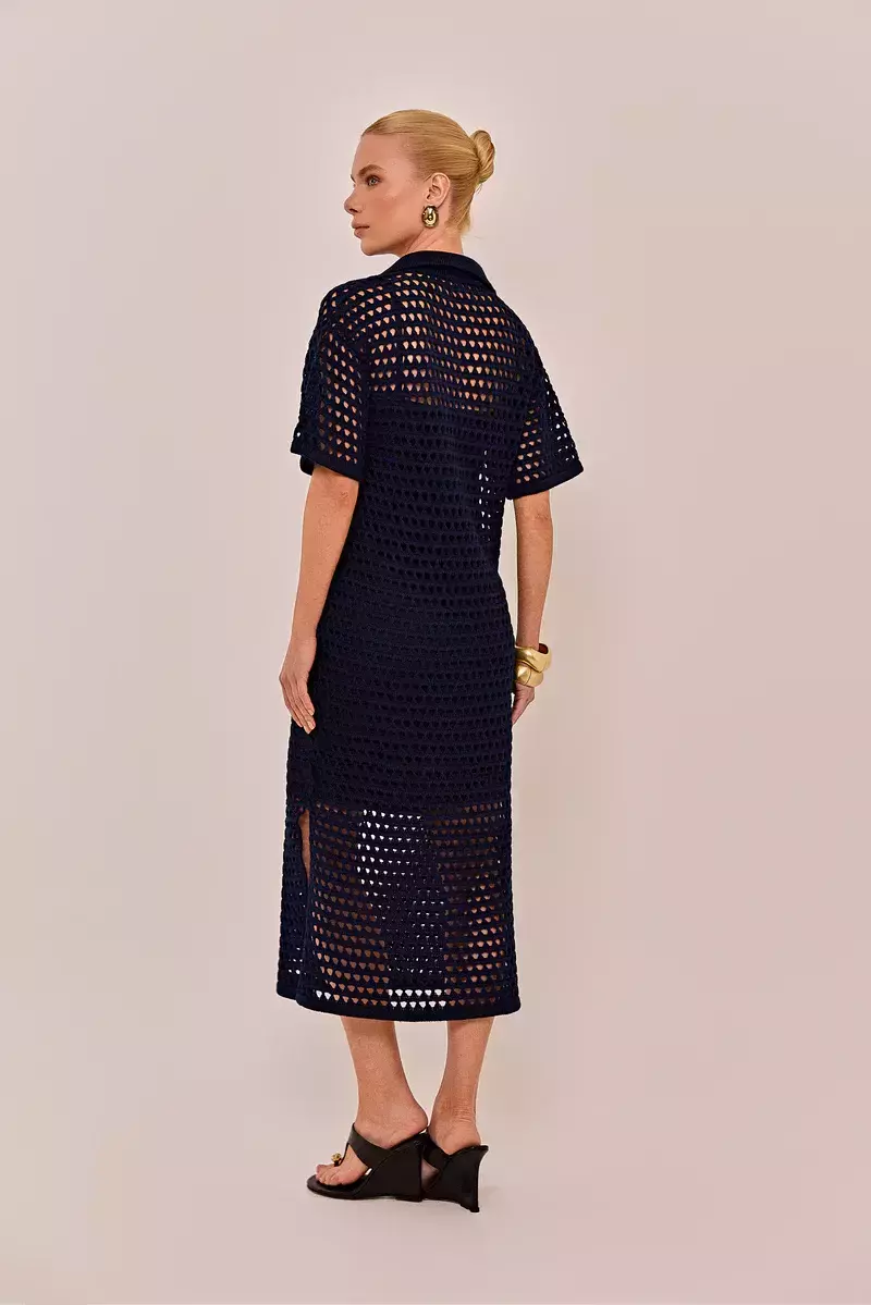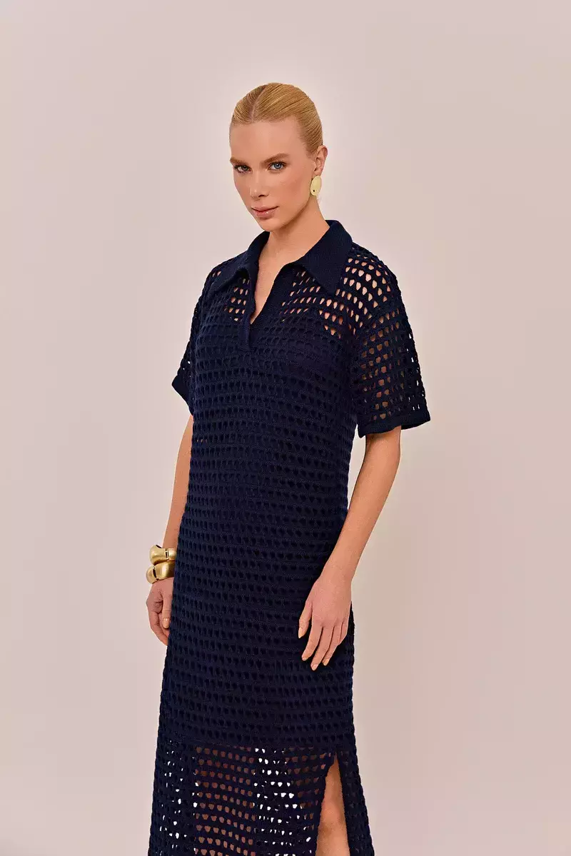 O vestido Pietra é feito em tricot, disponível na cor azul marinho. Com modelagem reta e comprimento midi, decote v, gola polo, fendas laterais e transparência leve, a peça une conforto e sofisticação. Acompanha forro avulso em malha na mesma cor da peça.